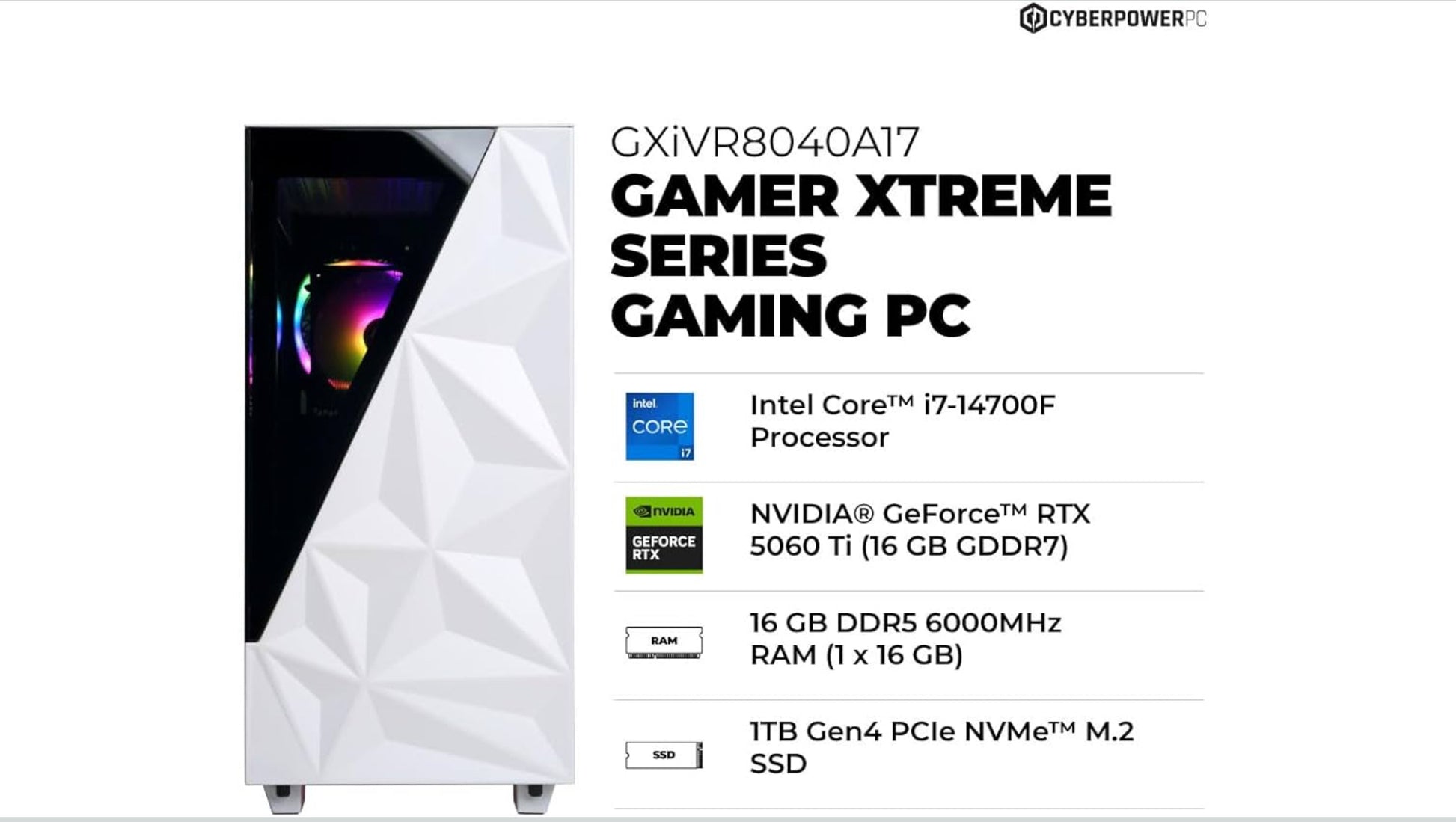 CyberPowerPC Gamer Xtreme VR Gaming PC, Intel Core i7-14700F 2.1GHz, GeForce RTX 5060 Ti 16GB, 16GB DDR5, 1TB PCIe 4.0 SSD, WiFi Ready & Windows 11 Home (GXiVR8040A17)