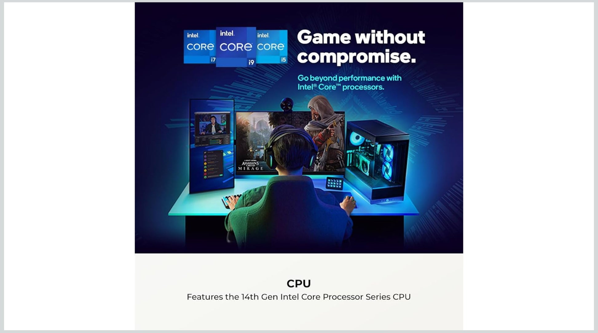 - System: Intel Core i7-14700F 2.1GHz 20 Cores | Intel B760 Chipset | 16GB DDR5 6000MHz | 1TB PCIe 4.0 NVMe SSD | Windows 11 Home