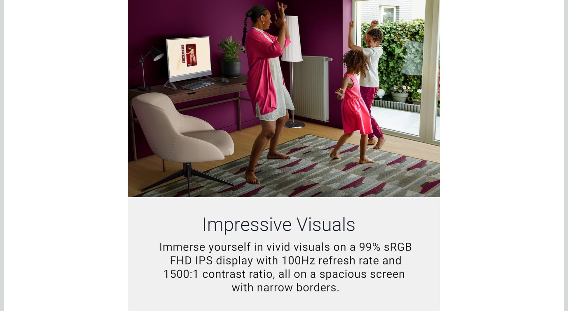 - Immersive visuals: The FHD IPS display features 99% sRGB and 50% higher contrast* within a narrow border so you can enjoy vivid, true-to-life colours as you work, learn or stream.