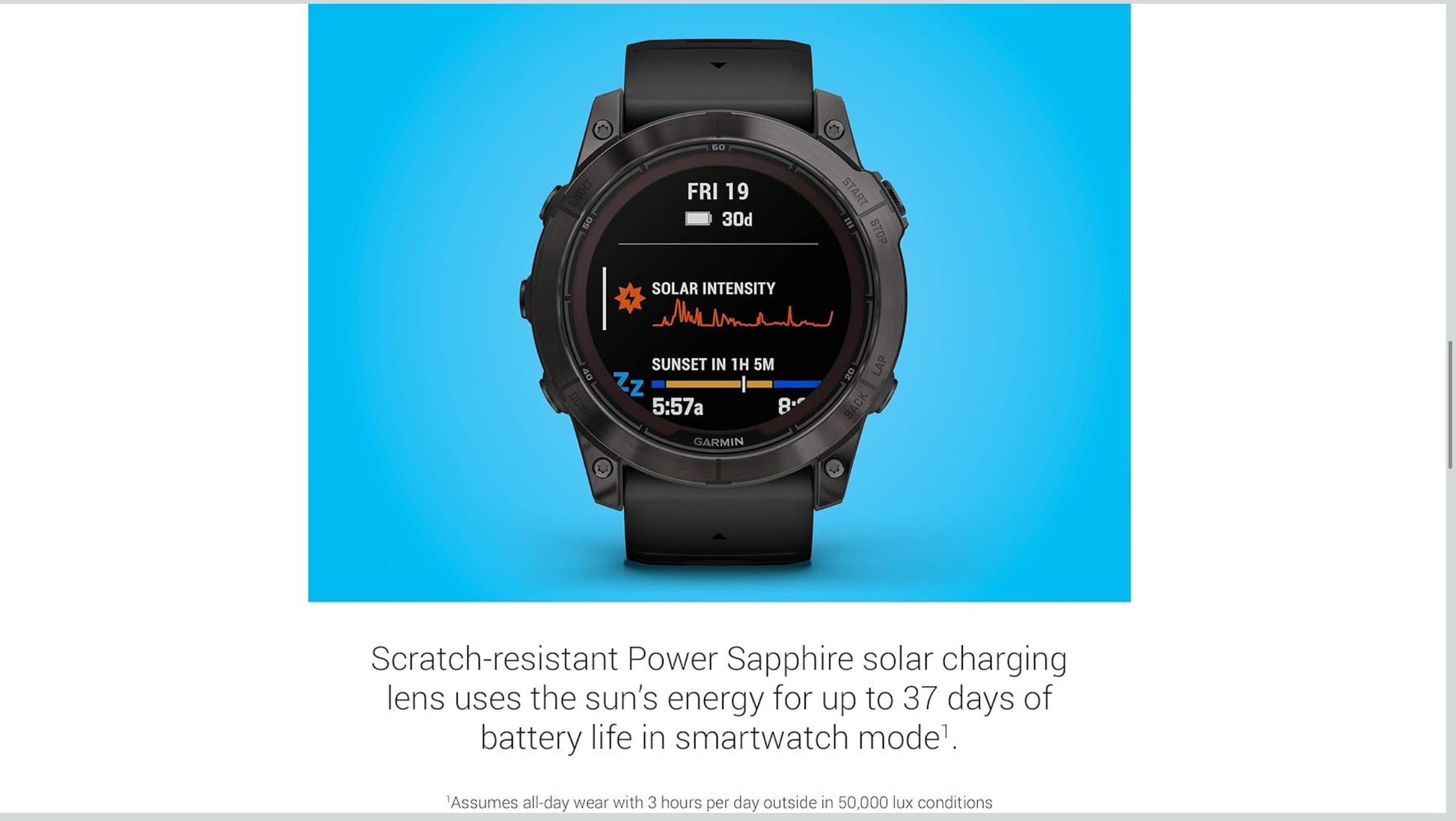 - Scratch-resistant Power Sapphire solar charging lens uses the sun’s energy for weeks of battery life in smartwatch mode