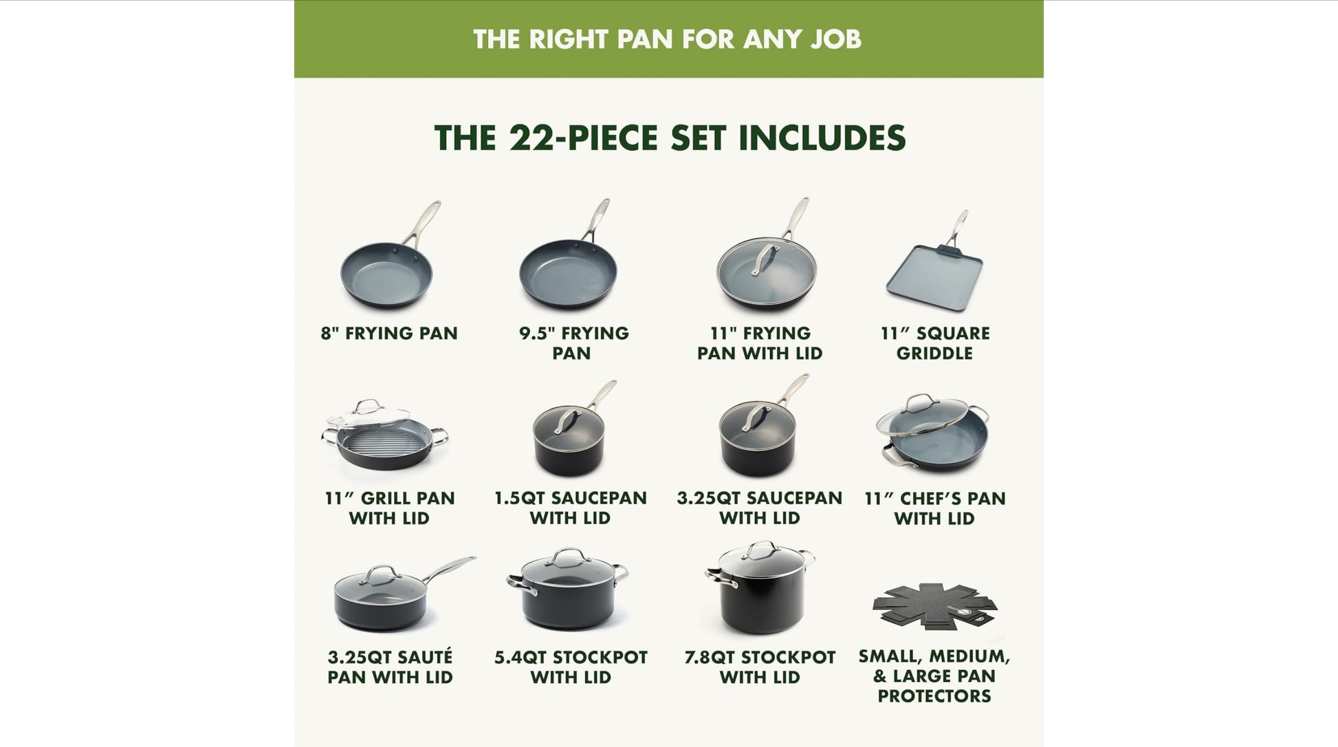 - 22 PIECE SET: Includes 8” and 9.5” frying pans; 11” frying pan with lid; 11” grill pan with lid; 11” chef’s pan with lid; 11” square griddle pan; 1.5qt and 3.25qt saucepans with lids; 3.25qt sauté pan with lid; 5.4qt and 7.8qt stock pots with lids; small, medium, and large pan protectors.